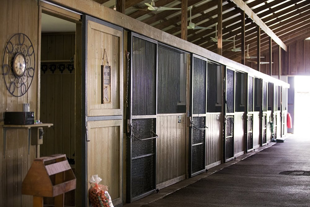 The farm has 3 barns, all equipped with large 12 x 12 stalls. Our state-of-the-art Main Barn boasts 24 stalls and 2 shed row barns with 8 stalls each, totally 40 stalls! Every stall is outfitted with rubber mats, automatic waterers and fans. Each barn provides ample protection from the elements, so you can come visit your equine friend regardless of the weather.